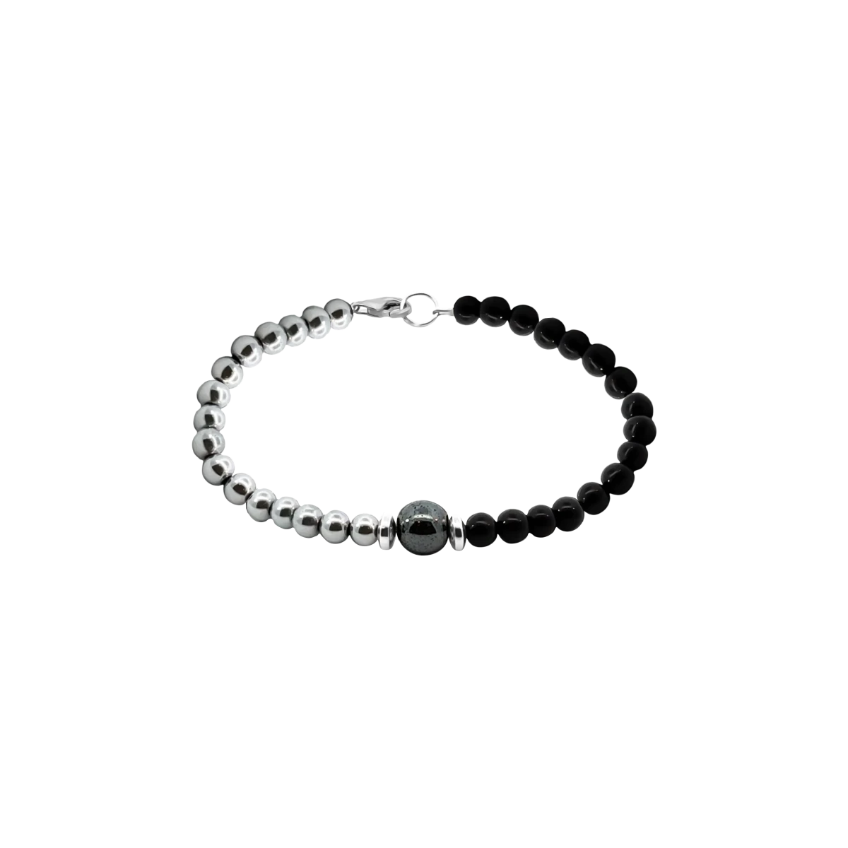 ZILIA pánsky náramok z hematitu v striebornom tóne s čiernym ónyxom prináša moderný štýl a nadčasovú eleganciu. Vhodný na každý deň aj na špeciálne chvíle, minerály sa tradične spájajú s rovnováhou, ochranou a sebadôverou.