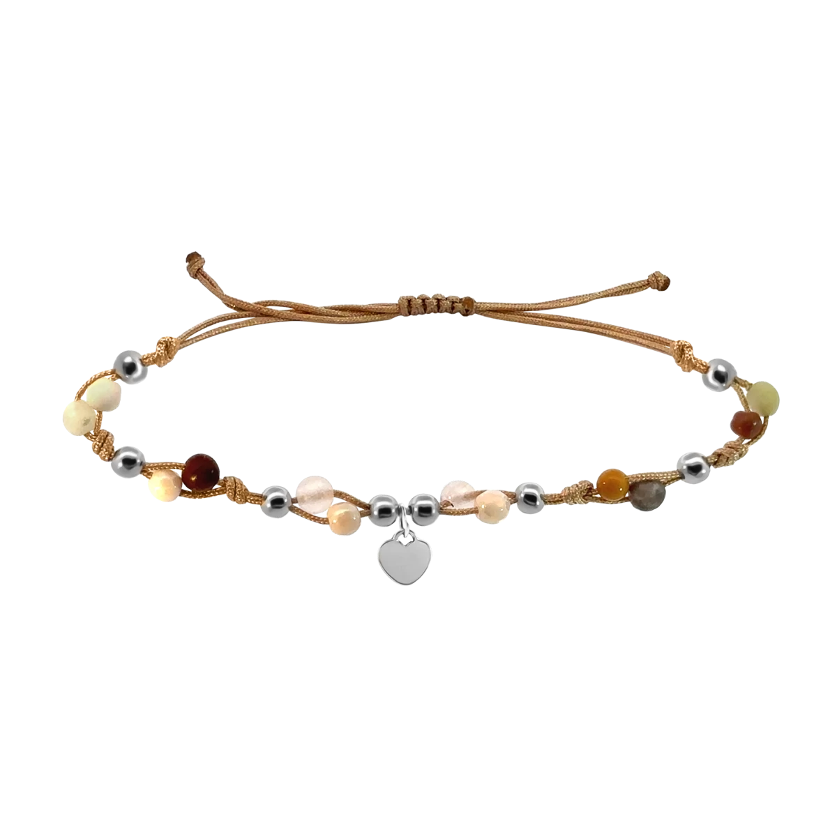 Strieborný 925 náramok na členok s farebnými minerálmi a makramé srdcom