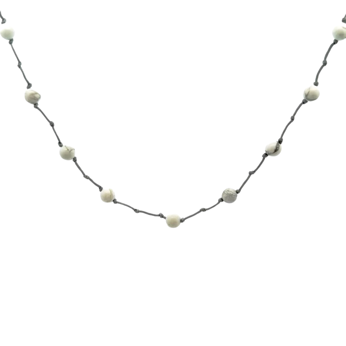 Ručne viazaný náhrdelník navlečený na farebnej pevnej a nezničiteľnej niti, s howlitovými guľôčkami a strieborným 925 zapínaním. Farbu nite je možné zmeniť podľa želania. Zvolenú farbu nám napíšte do komentárov!