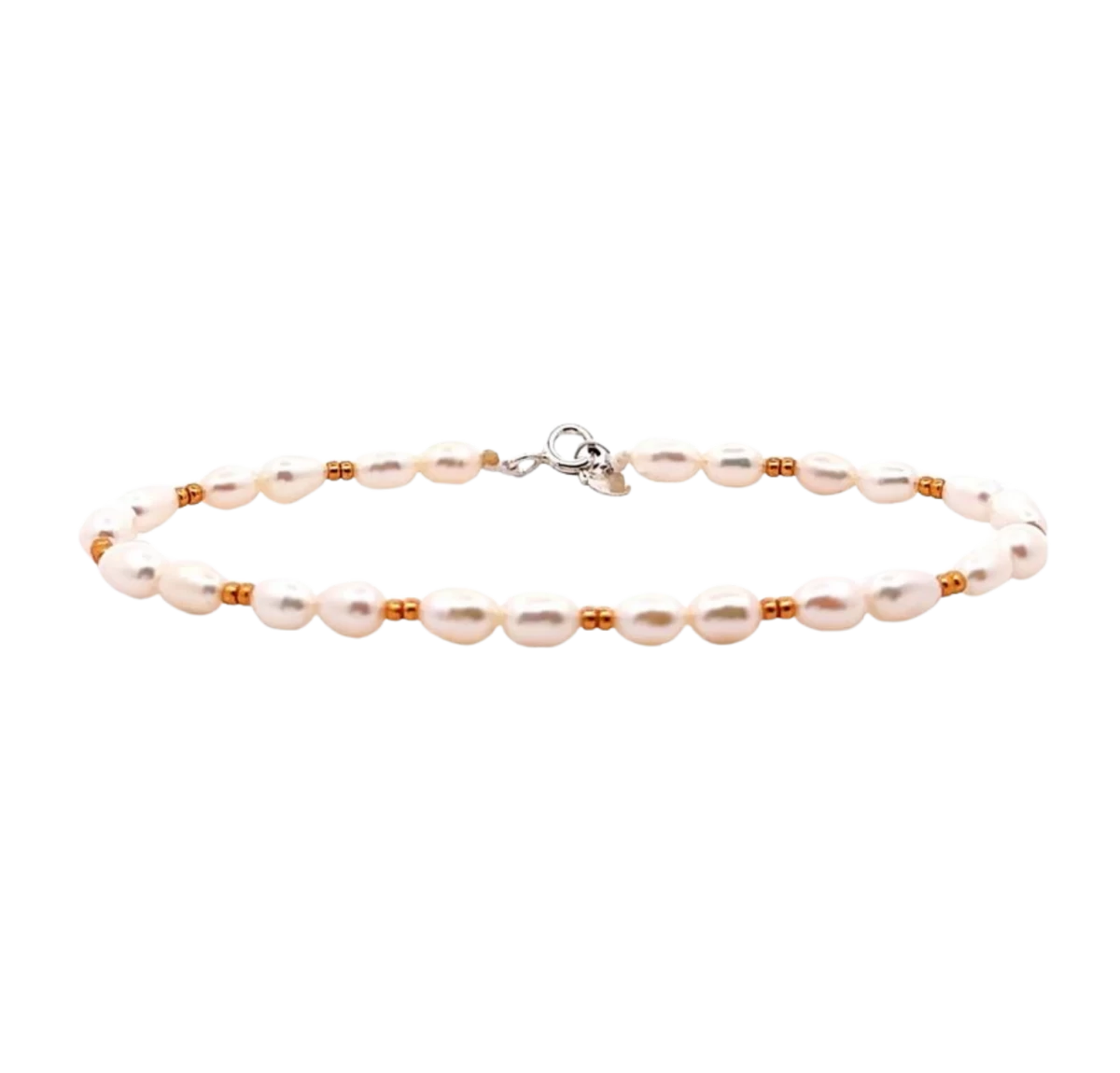 Náramok z bielych sladkovodných perál a žltých zlatých korálikov so striebrom 925