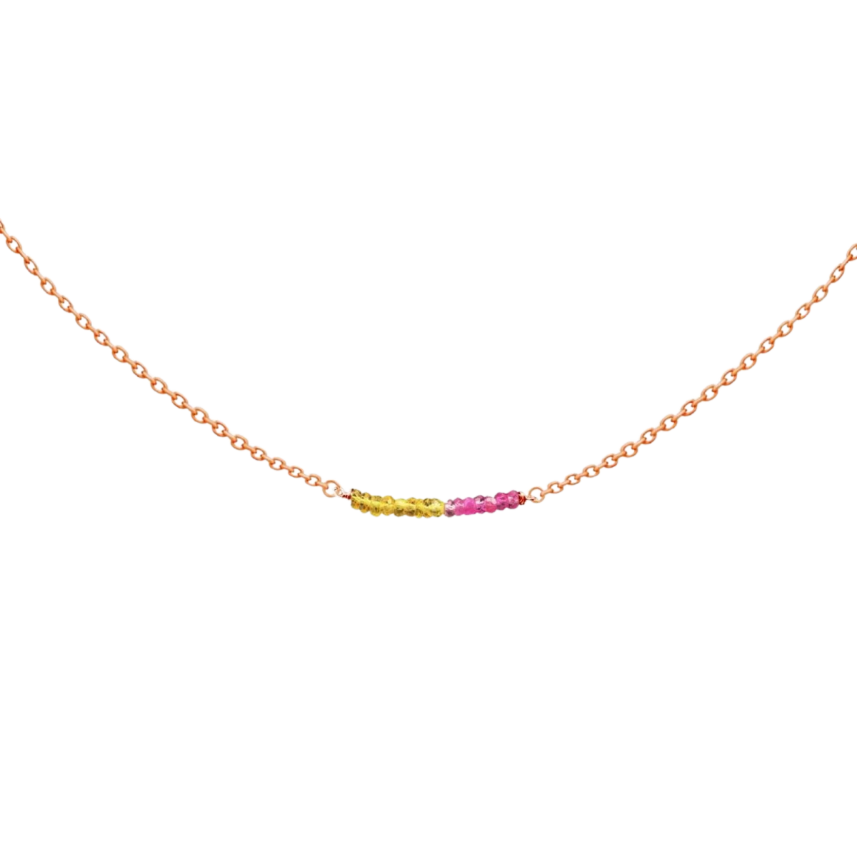 Vďaka tejto krásnej retiazke môžete nosiť pútavý kúsok z našej kolekcie drahých kameňov. Pripravte sa na harmonické stretnutie žltého zafíru a červeného rubínu v šperku, ktorý oživí váš vnútorný oheň. Odporúčame ho aj na bežné nosenie.