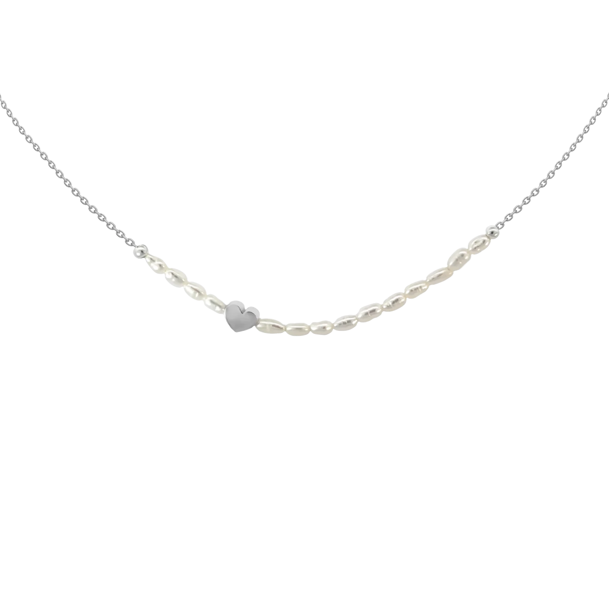 ZILIA prináša letný náhrdelník so sladkovodnými bielymi perlami ryžového tvaru a jemnou kotvovou retiazkou. V strede žiari strieborné srdce ako symbol elegancie lásky spojenia a vnútornej harmónie. Nadčasový akcent pre moderný štýl a ľahké vrstvenie.