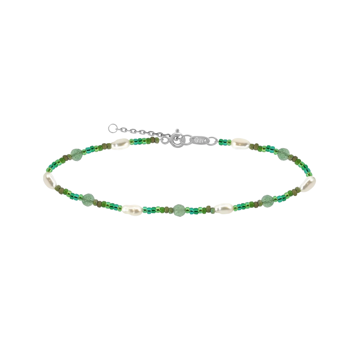 Náramok ZILIA spája zelené koráliky a aventurín pre šťastie s bielymi ryžovými perlami, ktoré žiaria sviatočnou eleganciou a vďaka retiazke sadnú každému.
