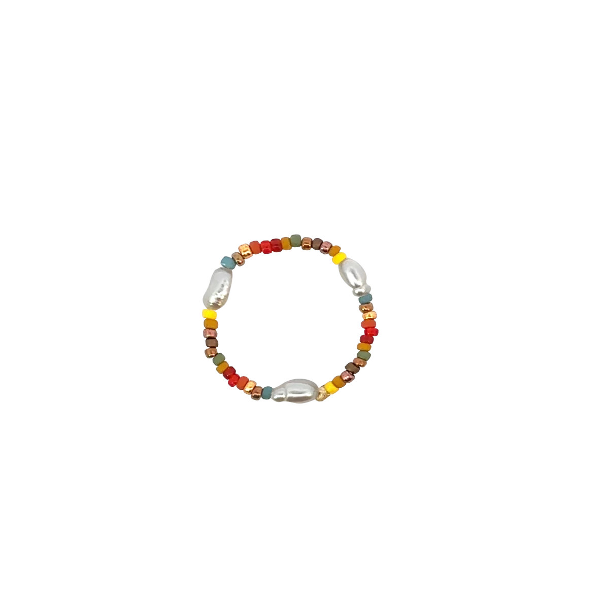 Jesenný prsteň ZILIA s ručne navliekanými korálikmi v odtieňoch medenej žltej a červenej a s bielymi riečnymi perlami rozžiari každý outfit. Ideálny šperk na každodenné nosenie aj ako jemný darček pre milovanú osobu.
