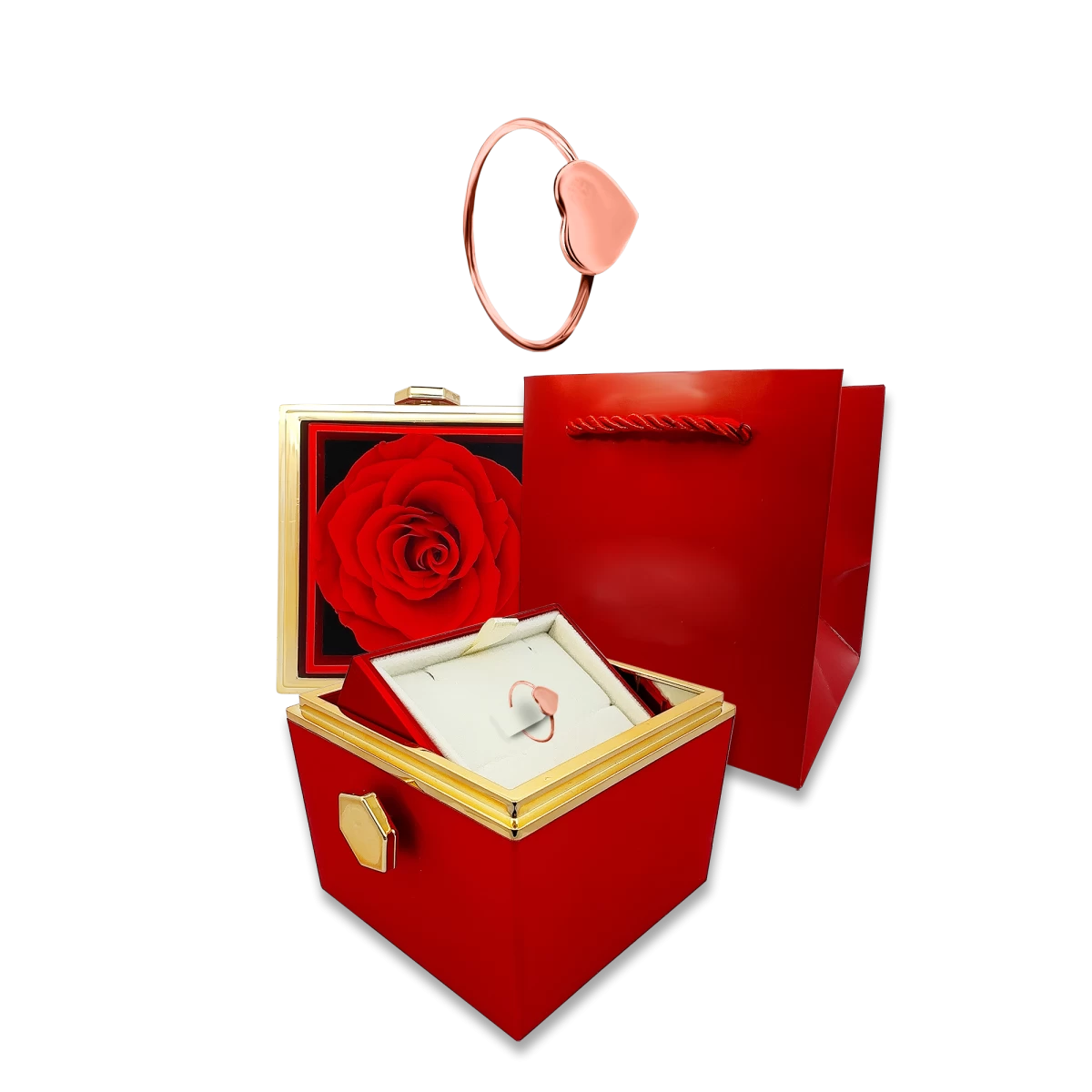 Ak hľadáte jedinečný a trvácny darček, vyberte si náš prsteň z ružového zlata v tvare srdca, ktorý dodávame v elegantnom balení s ružou. Týmto spôsobom nedarujete len krásny šperk, ale aj špeciálne prekvapenie, ktoré otvára nový rozmer vyjadrovania lásky a náklonnosti, a to vďaka ruži v krabičke, ktorá si môže zachovať svoju čerstvosť až 3 roky.
