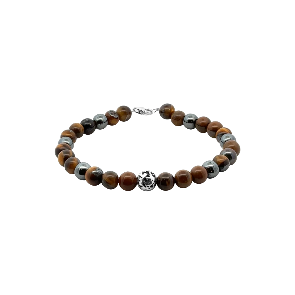 Štýlový pánsky náramok ZILIA s tigrím okom lávovým kameňom a hematitom. Zlatohnedý lesk dodá sebavedomie a sústredenie láva upokojí myseľ hematit uzemní.