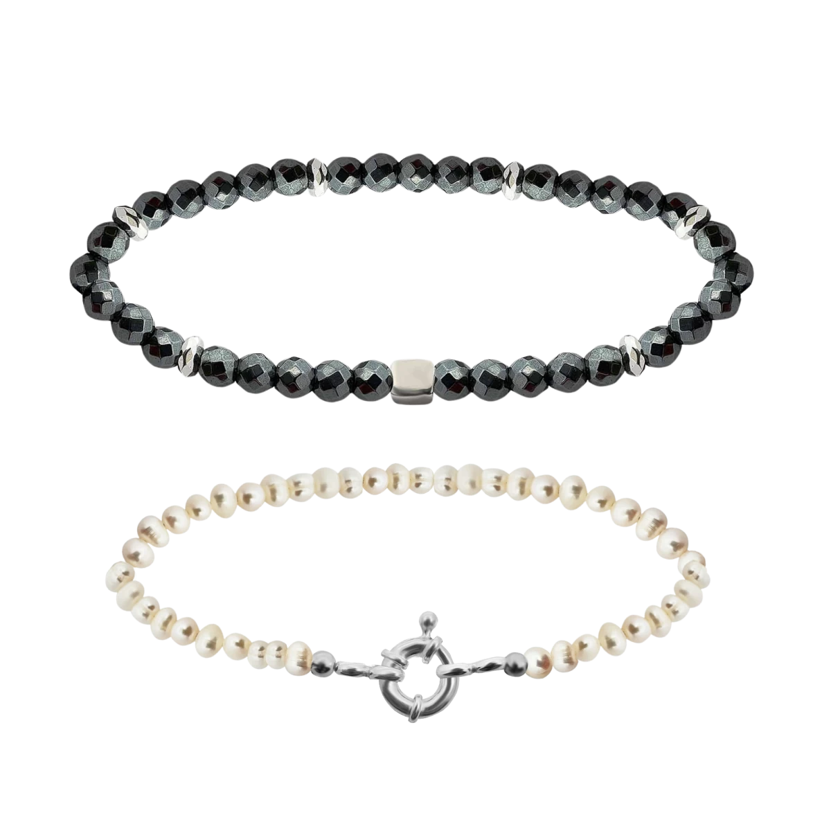 Objavte jedinečnú kolekciu náramkov, kde sa spája sila hematitu so striebornými detailmi a nadčasová krása bielych perál s výrazným strieborným zapínaním. Doprajte si elegantný doplnok, ktorý podčiarkne harmóniu vášho štýlu a prinesie do každého outfitu moderný nádych.